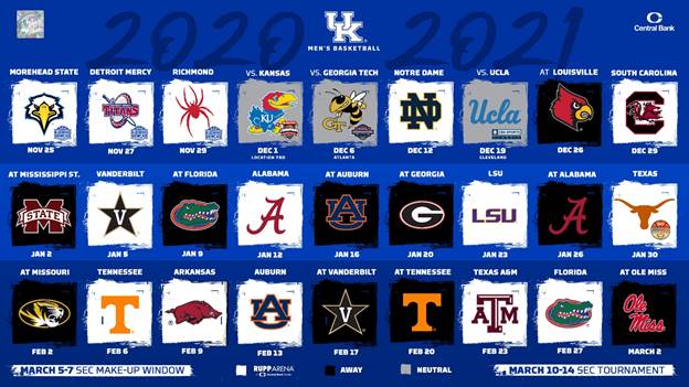 #6 Kansas Dec. 1, #12 Tennessee Feb. 6 and Feb. 20, #19 Texas Jan. 30, #22 UCLA Dec. 19. Other dates on the calendar to circle are against unranked teams LSU Jan. 23, Florida Jan. 9 and Feb. 27, Alabama Jan 12 and Jan 26. The annual bluegrass showdown with Louisville is Dec 26.