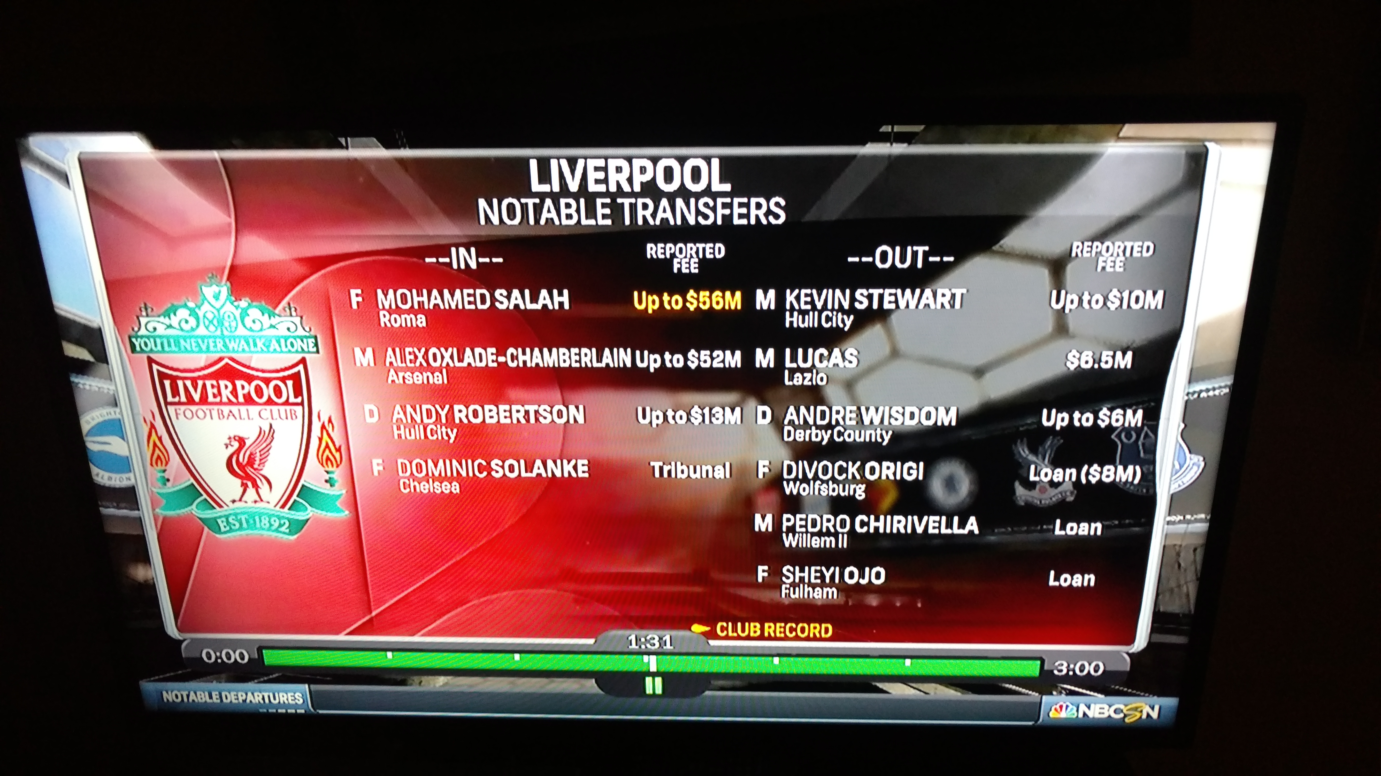 Liverpool FC Summer Transfer Window Major Additions: Winger Mohamed Salah, Midfielder Alex Oxlade-Chamberlain, Central midfielder Naby Keita, for next summer.