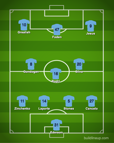 The attack will probably see the return of Gabriel Jesus on the right-hand side, with Jack Grealish playing on the left. Phil Foden starts centrally.