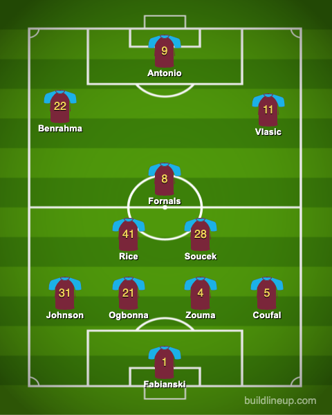 Declan Rice and Tomas Soucek will probably start. You’d just about be able to knock me over with a feather if they don’t start. Cannot speak highly enough of this defensive midfield duo. Simply world-class. Pablo Fornals starts just ahead of them in a midfield three.