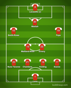 Record signing Nicolas Pepe will look to showcase what he can offer to the team. In what are becoming increasingly rare opportunities for him, the Ivory Coast international needs to perform, or he might find that he is on his way out of North London. Emile Smith-Rowe will probably start on the opposite flank after appearing from the bench in the last two Premier League fixtures.