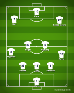 In attack, Harry Kane will play centrally. He’s back in the goals and that is bad news for every team that is not Tottenham. South Korean Heung Min Son and Brazilian Lucas Moura will flank him.