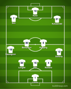 Cristian Romero returns to the back three after an injury lay off. His usual partner in crime, Eric Dier, joins him. Clement Lenglet comes in to play on the left-hand side of the Englishman. Mat Doherty comes in for Emerson Royal and Ryan Sessegnon starts ahead of Ivan Perisic.
