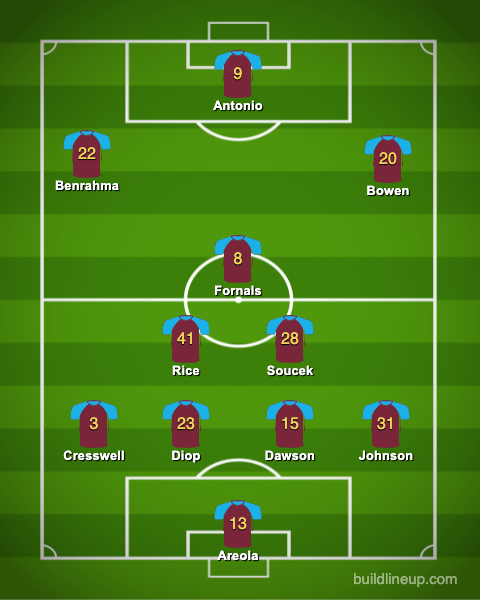 Given the opportunity to qualify for a quarter-final, I am going to predict that we will see the Hammers go full strength in midfield. That means Declan Rice and Tomas Soucek start in a deep midfield pivot, with Pablo Fornals starting as the most attacking of the midfield three.