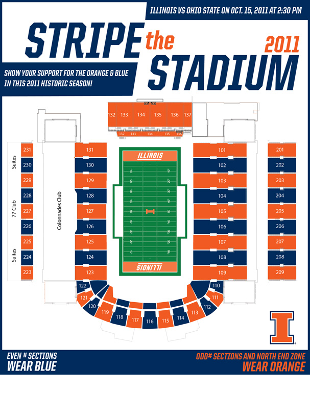 Fans attending Saturday’s game are encouraged to “Stripe the Stadium” by wearing either orange or blue depending on the section where their seats are located. Fans seated in the odd-numbered sections and the entire north end zone are asked to wear orange, while fans in the even-numbered sections should wear blue. Fans also will be a part of the Stripe the Stadium FanCam at halftime, a 360-degree, high-definition image of Memorial Stadium.