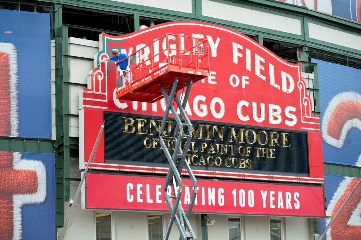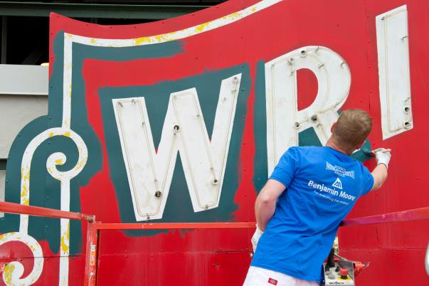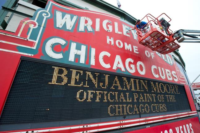 Here you can see Mike Kwiatkowski putting the first brush strokes on the Wrigley Field Marquee (Photos for Benjamin Moore/Brian Kersey)