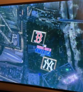 Before cutting to commercial, the graphics team on the FOX Sports broadcast placed their Baseball Night in America logo directly in the middle of the World Trade Center Memorial site. They also put the Red Sox logo in the space where the north tower once stood, prior to 9/11. This supplemented the Yankees logo in the space where the south tower once stood. Have a look: